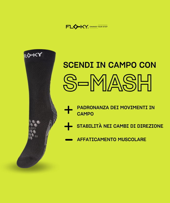 La calza S-MASH 2.0 è la prima calza biomeccanica studiata per il padel e il tennis, progettata per offrire massima stabilità e protezione durante i movimenti rapidi in campo.