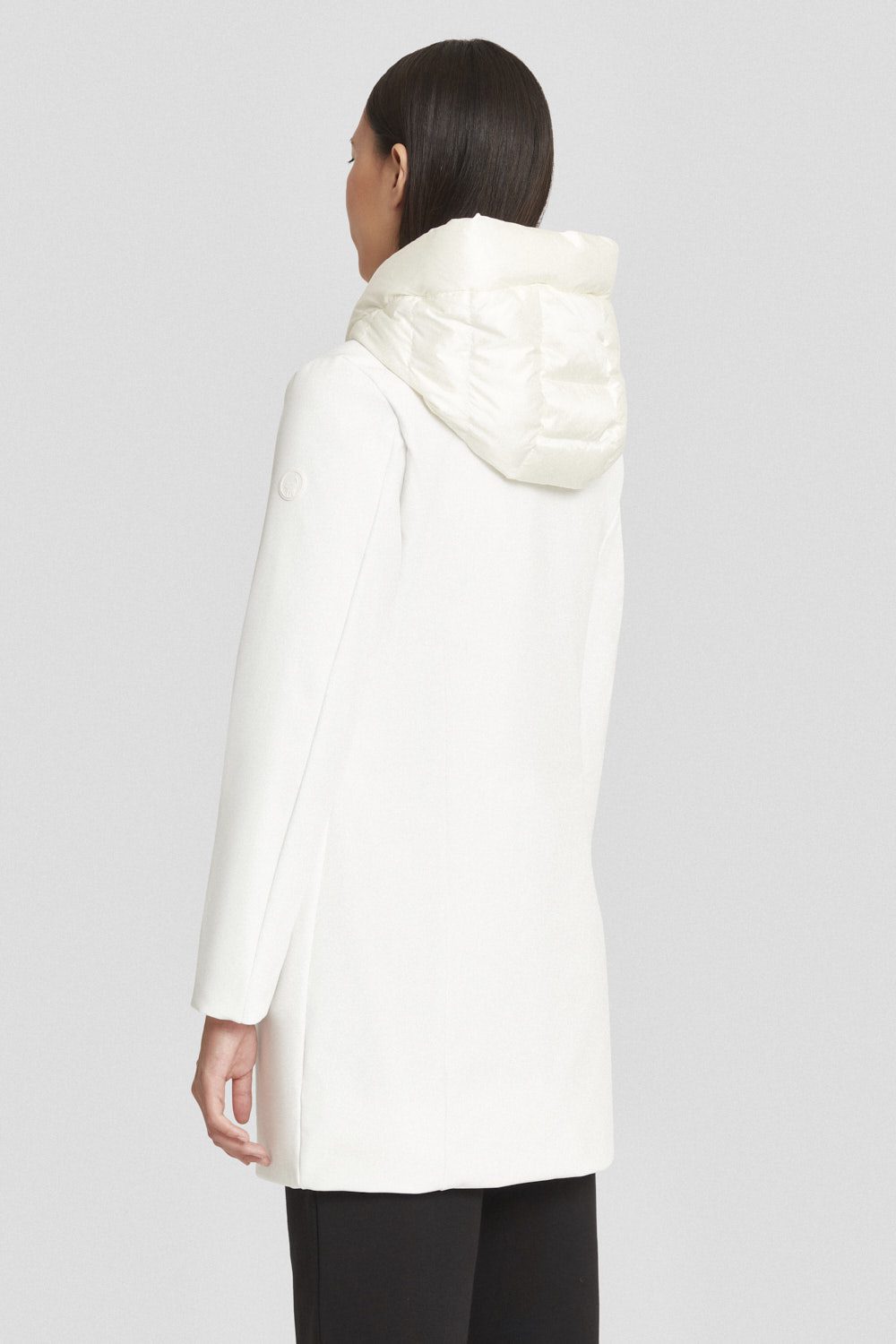 Giacca lunga bianca da donna, realizzata in tessuto softshell 3 layers con laminazione dry-tech e imbottita in vera piuma 80/20.