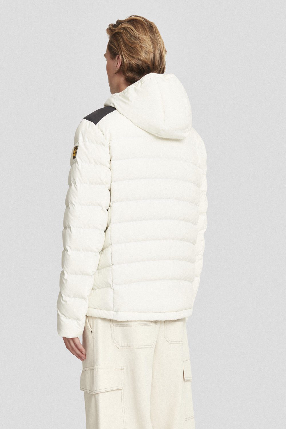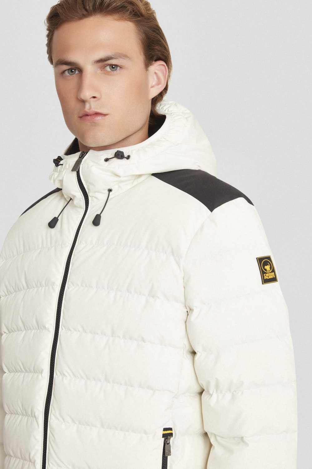 Piumino corto bianco 200 grammi con cappuccio e imbottitura in vera piuma 90/10, creato per offrire protezione e leggerezza. Realizzato in resistente tessuto micro ripstop di poliestere con trattamento DWR, è rifinito da un rinforzo in canvas nero sulle spalle e zip nere con doppio cursore. Completano il design le personalizzazioni iconiche in gros grain giallo/nero, per un look tecnico e distintivo.